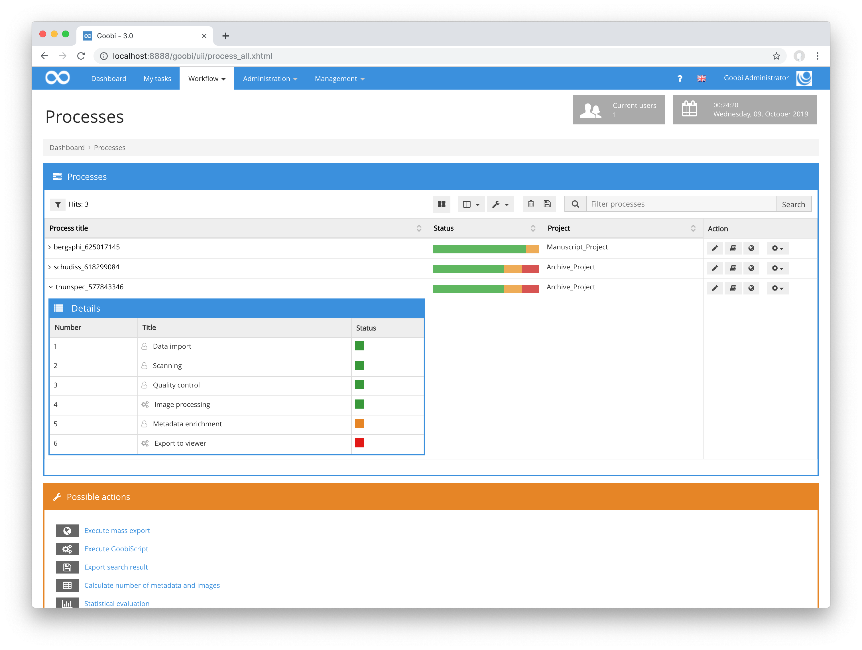 Neben den Kernfunktionen von Goobi workflow stehen als Erweiterung eine Vielzahl unterschiedlicher Plugins zur Verfügung. So existieren derzeit insgesamt etwa 210 solcher Plugins verschiedener Typen. Projektmanager können etwa mit den Statistik- und Administrations-Plugins den genauen Verlauf des Projektes überwachen, auswerten und auch Reports generieren. Den Administratoren von Goobi workflow hingegen stehen mächtige Tools zur Seite, mit denen auf einfache Art- und Weise Massenmanipulationen an dem Datenbestand vorgenommen werden können.